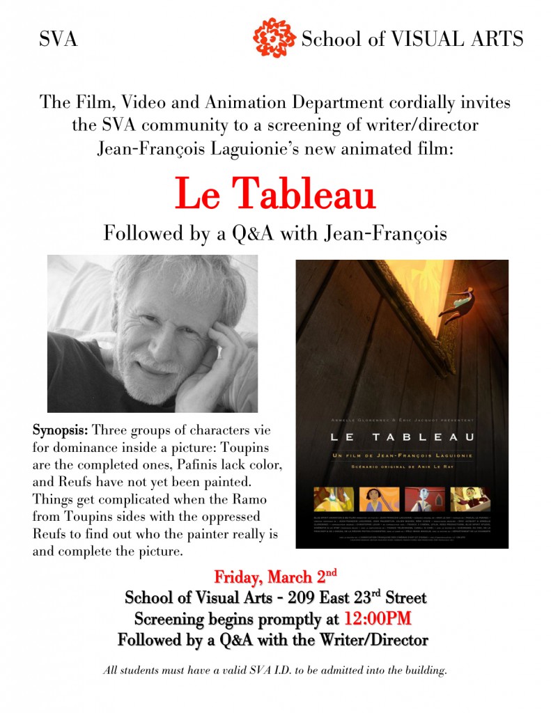 Hello ASIFA community!  SVA cordially invites you to take part in a screening of Le TAbleau followed by a Q&A with writer/director JEAN-FRANCOIS LAGUIONIE on Friday, March 2nd. Please see…