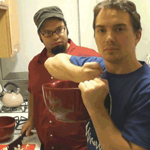 Rob Yulfo and Stephen Brooks baking an apple pie and discussing the character-art of “Rise of the Guardians.”